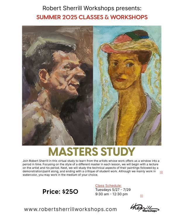 Join Robert Sherrill in this virtual ZOOM study to learn from the artists whose work offers us a window into a period in time. Focusing on the style of a different master in each lesson, we will begin with a lecture on the artist and his period. Next, we will study the technical aspects of their paintings followed by a demonstration/paint along, and ending with a critique of student work. Although we mainly work in watercolor, you may work in the medium of your choice.